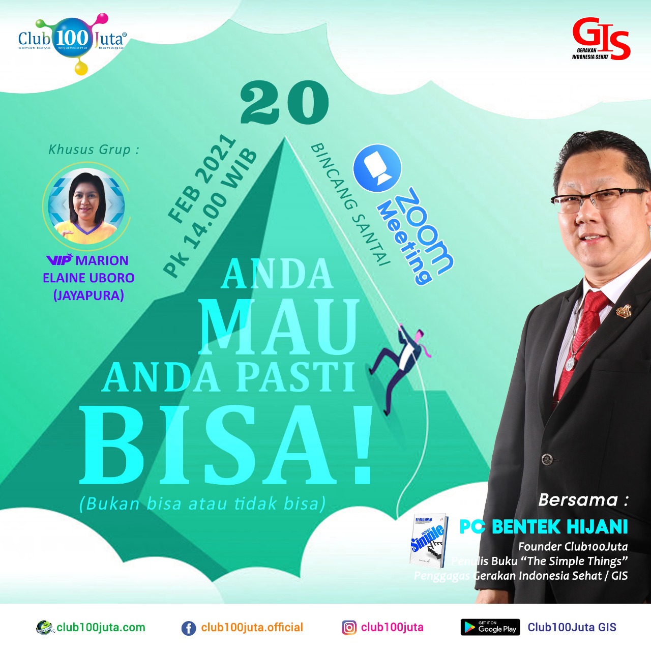 Top Leader Club100Juta KK Indonesia bapak Platinum Club Bentek Hijani yang akan diadakan pada :